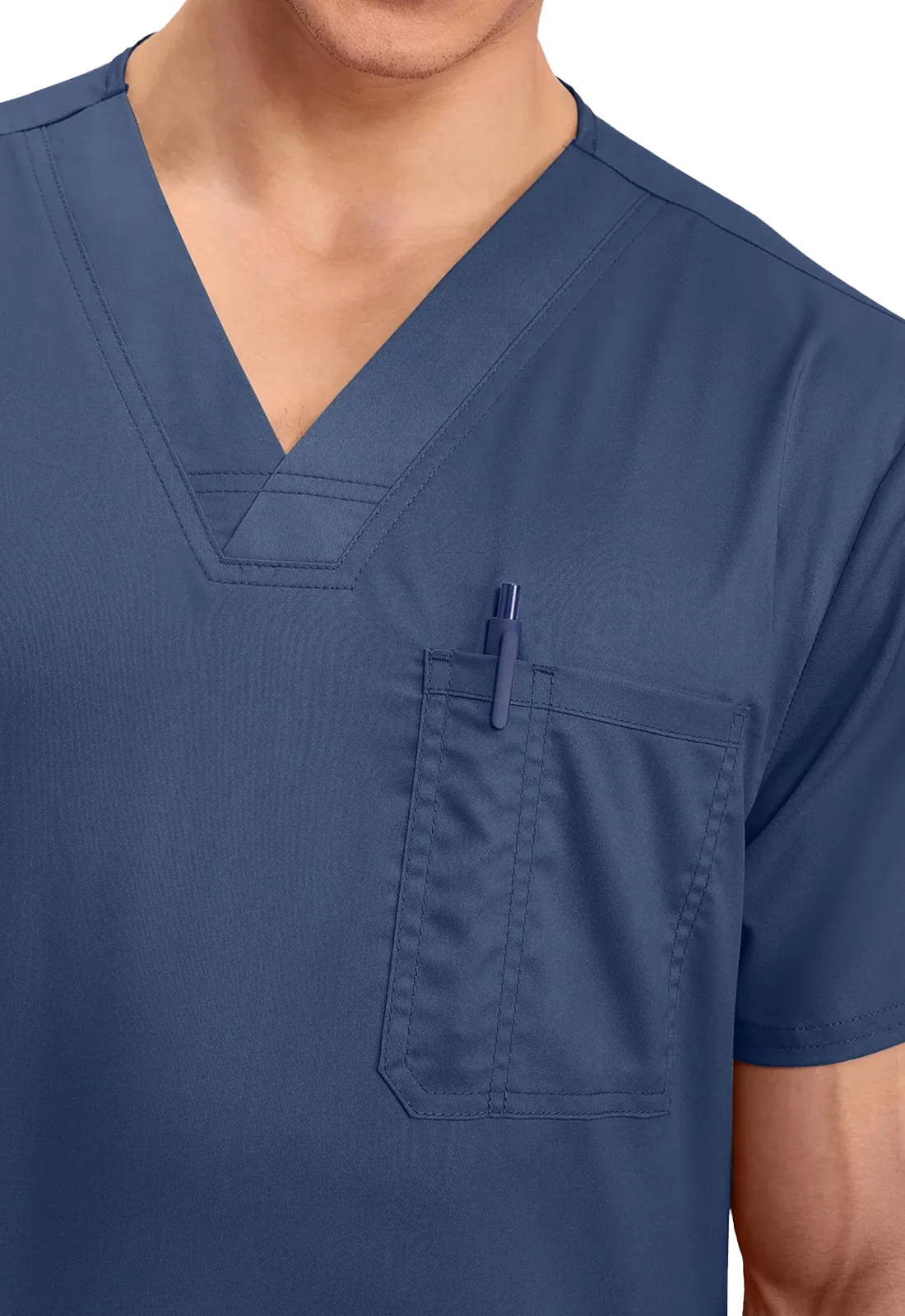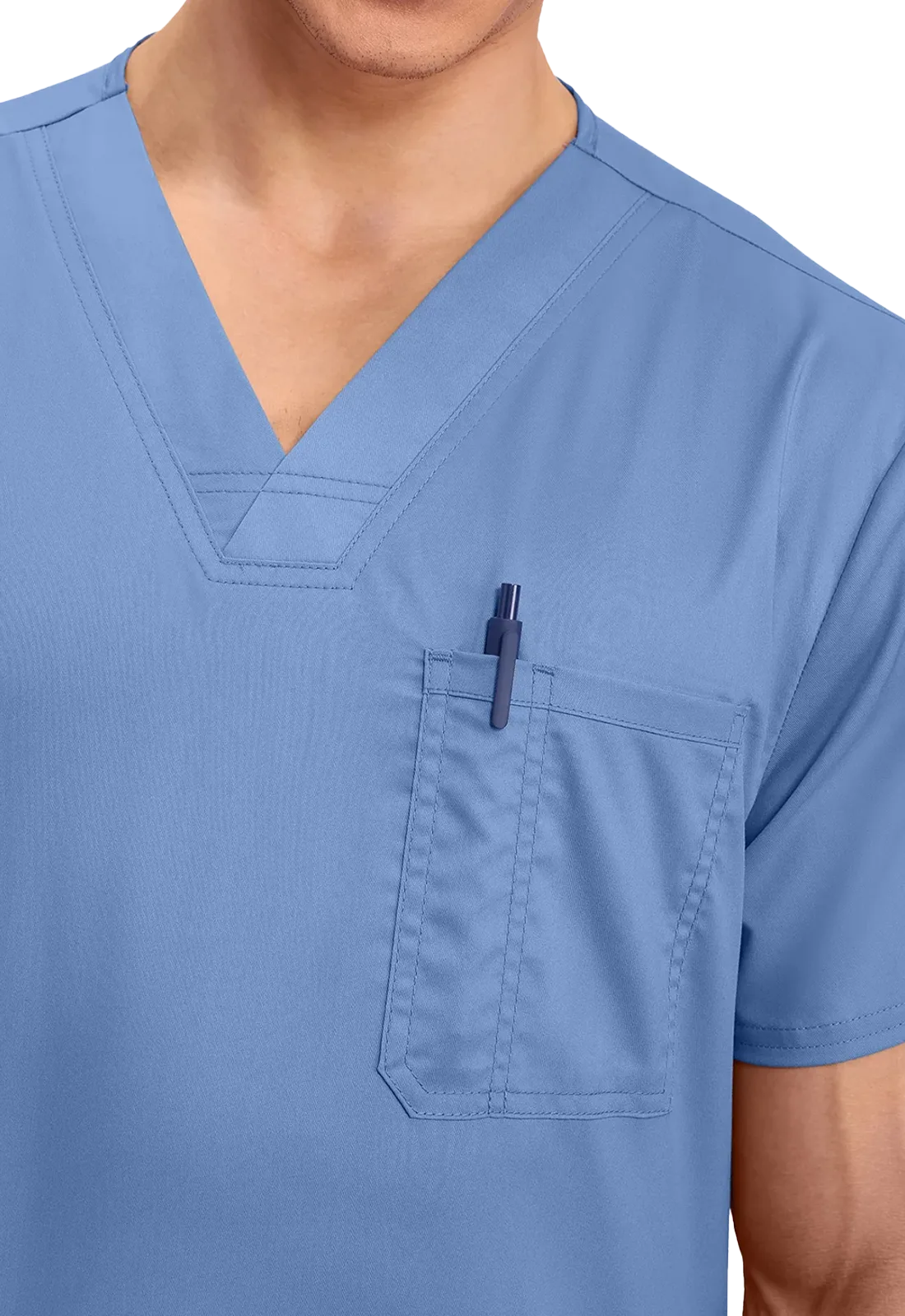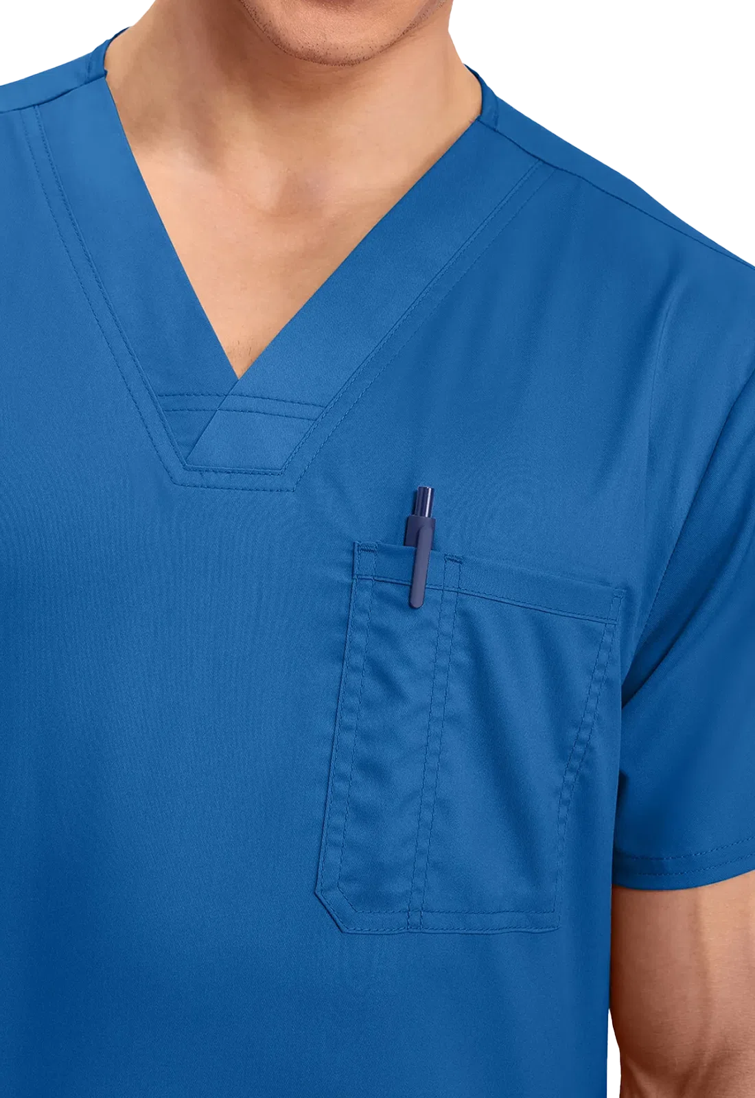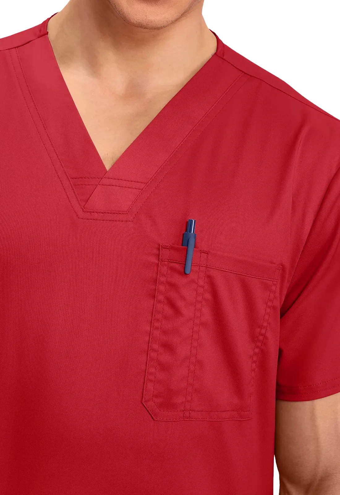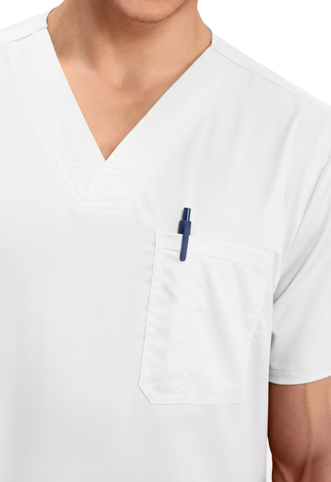 • Um bolso no peito com divisão para caneta e dois bolsos inferiores